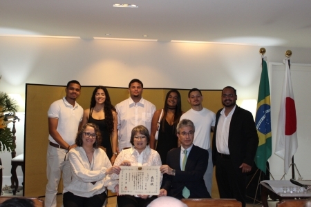 | 11月15日、アソシアソン・ナガイのシルヴァナ・ハルミ・ナガイ会長に対する外務大臣表彰式が公邸にて執り行われました。ナガイ氏は、長年にわたり柔道の普及と柔道を通じた社会活動に取り組み、多くの青少年や地域社会の子供たちを支援されてきました。 同氏は、日本の価値観である「規律、敬意、克服」を脆弱な地域社会を変革するために活用する「JAÉ(柔道、芸術、教育)」というメソッドを確立しました。 柔道を通じたブラジルにおける日本文化の普及及び日本とブラジルの相互理解の促進に貢献されたことに敬意を表しますとともに、この度の受賞をお祝い申し上げます。 |